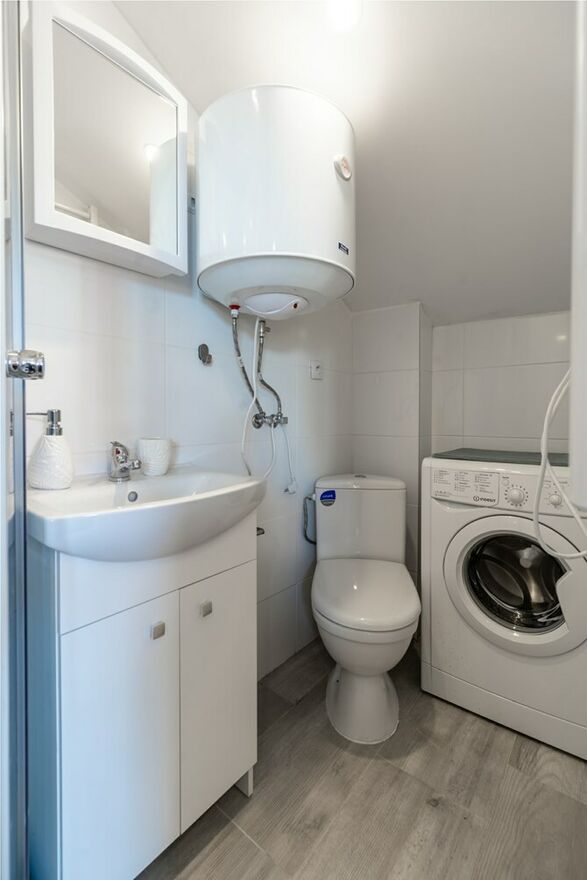 Łazienka z WC: kabina prysznicowa, umywalka, pralka, bojler