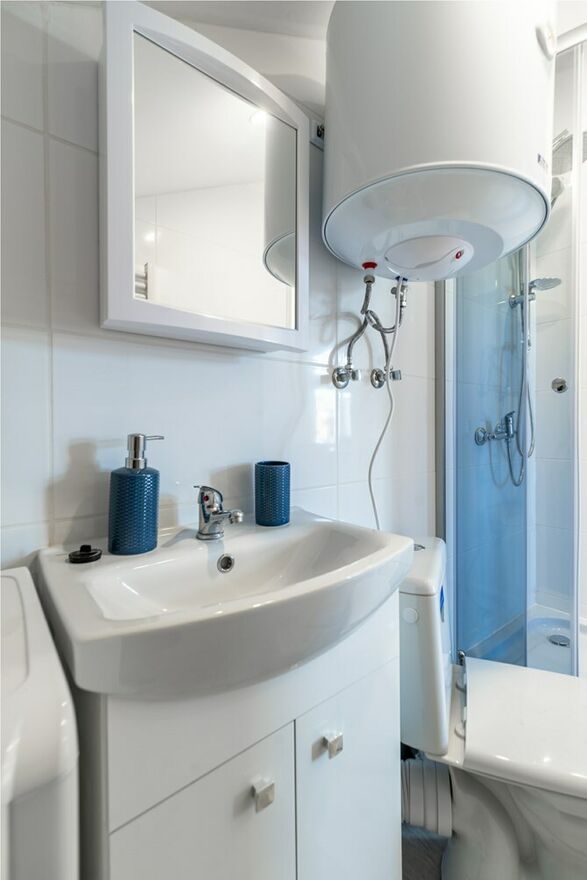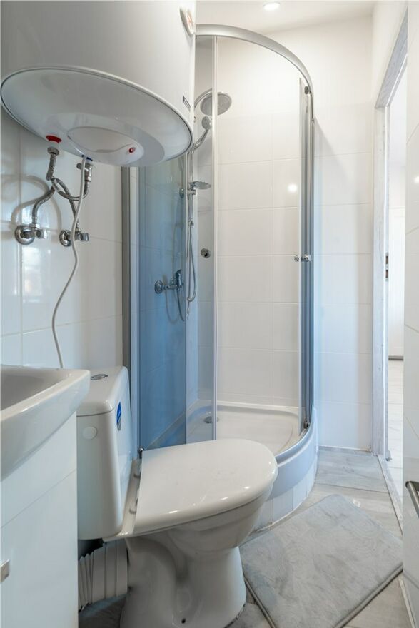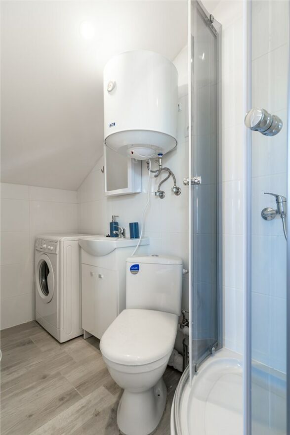 Łazienka z WC: kabina prysznicowa, pralka, umywalka, bojler